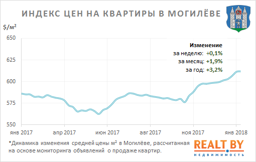 Средняя цена предложения в объявлениях о продаже квартир в Могилёве на минувшей неделе выросла на 0,1% и составила 612 $/м2.