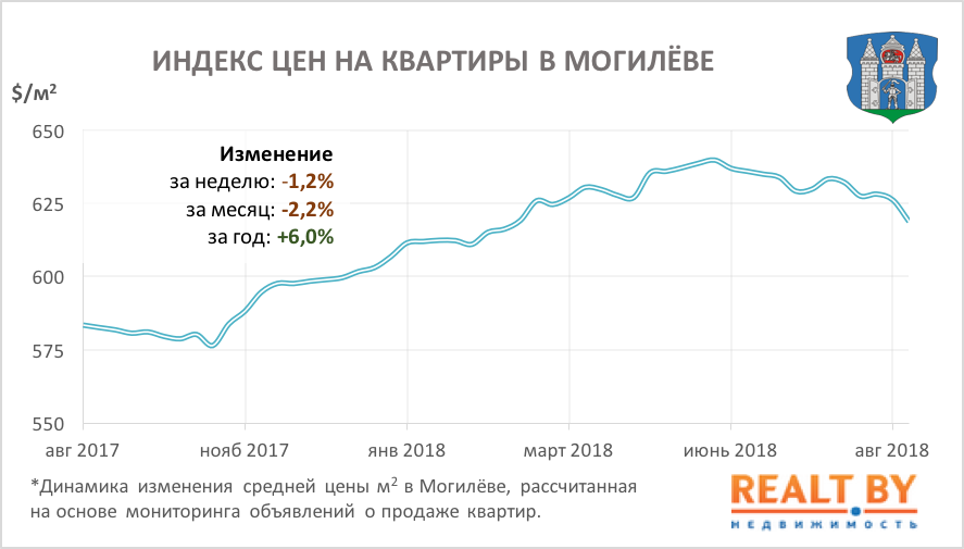 Средняя цена предложения в объявлениях о продаже квартир в Могилёве на минувшей неделе снизилась на 1,2% и составила 619 $/м2.