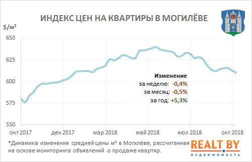 Средняя цена предложения в объявлениях о продаже квартир в Могилёве на минувшей неделе снизилась на 0,4% и составила 610 $/м2.