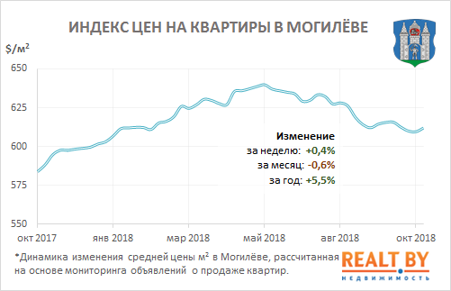 Средняя цена предложения в объявлениях о продаже квартир в Могилёве на минувшей неделе выросла на 0,4% и составила 612 $/м2.