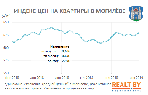 Средняя цена предложения в объявлениях о продаже квартир в Могилёве на минувшей неделе выросла на 0,6% и составила 630 $/м2.
