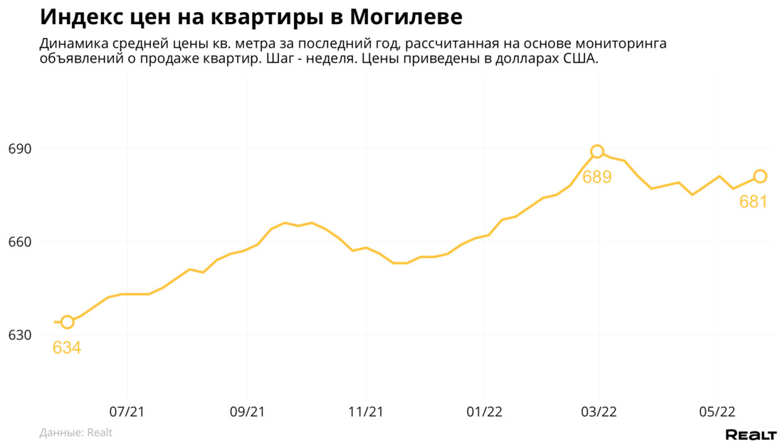 На 1% выросла средняя цена 1-комнатных квартир, которые на данный момент продаются в среднем по 735 $/м2. Средняя цена на 2-комнатные квартиры в Могилеве составляет 677 $/м2 (+1% за неделю). За 3-комнатные квартиры в областном центре просят в среднем 653 $/м2, что на 1% меньше, чем неделей ранее.
