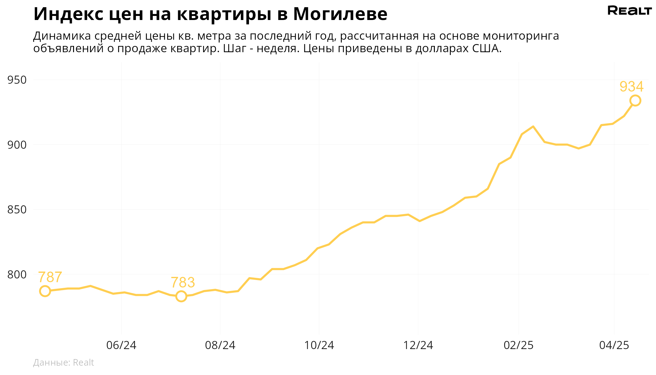 За неделю, с 7 по 14 апреля 2025 года, средняя цена в объявлениях о продаже квартир в Могилеве выросла на 1.3% и составила 934 $/м2. При этом количество квартир в продаже уменьшилось на 5.1%. Что еще произошло на рынке жилья крупнейших городов Могилевской области за семь дней — в материале.