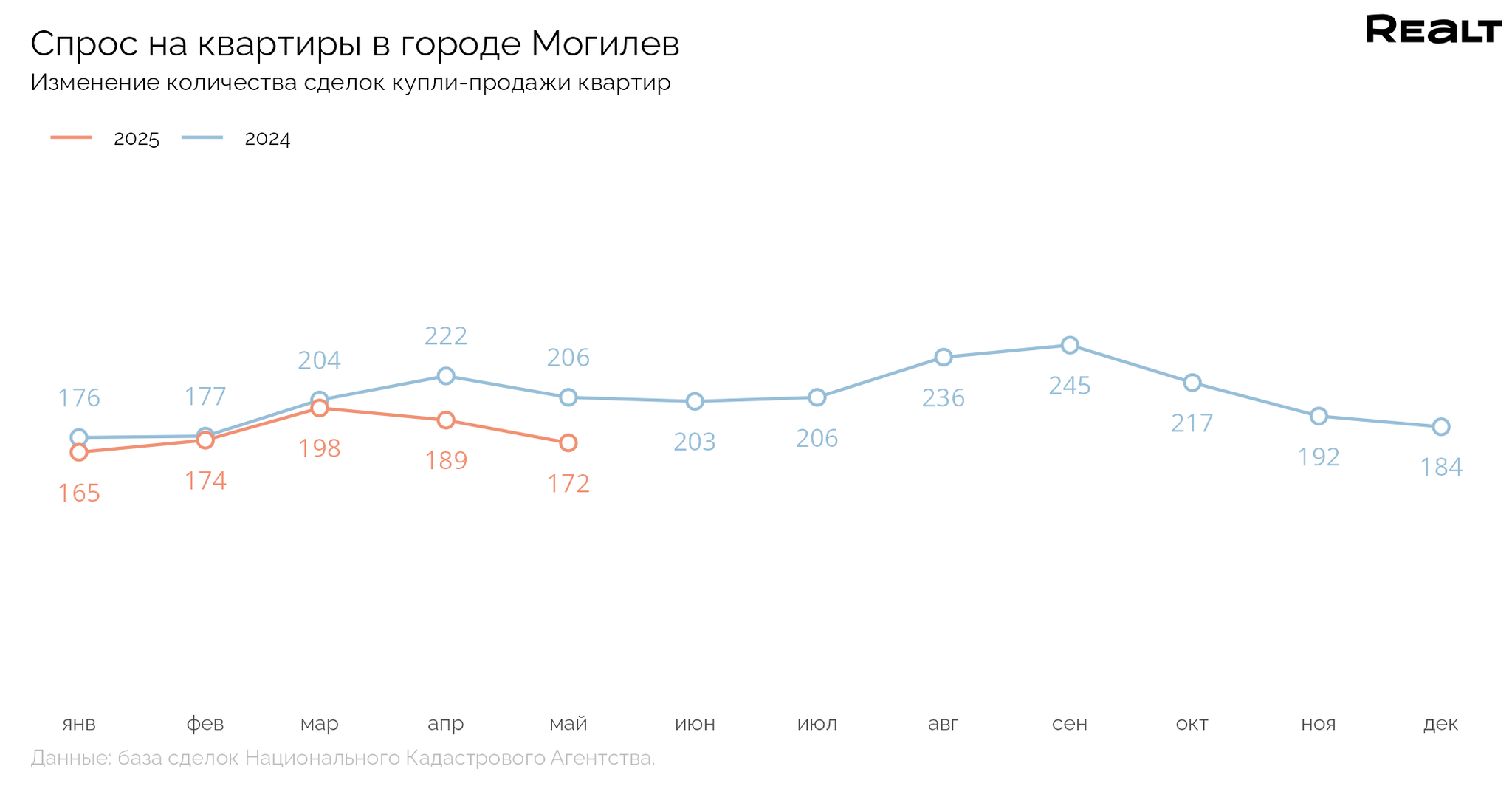 За май в Могилеве заключили 172 сделки купли-продажи квартир. По сравнению с аналогичным месяцем прошлого года спрос на квартиры уменьшился на 16.5%.