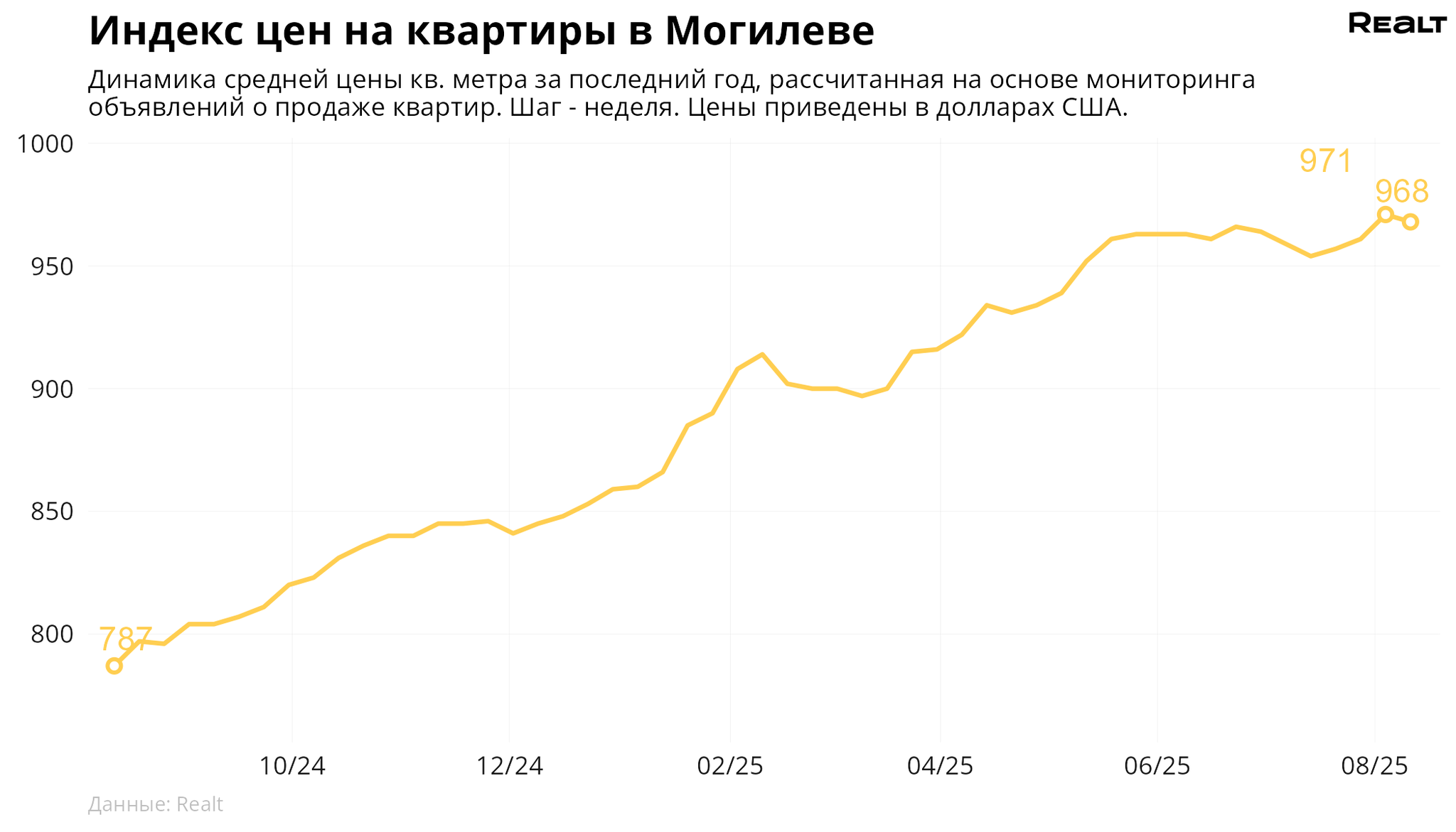 За неделю, с 4 по 11 августа 2025 года, средняя цена в объявлениях о продаже квартир в Могилеве снизилась на 0.3% и составила 968 $/м2. При этом количество квартир в продаже увеличилось на 2.1%. Что еще произошло на рынке жилья крупнейших городов Могилевской области за семь дней — в материале.