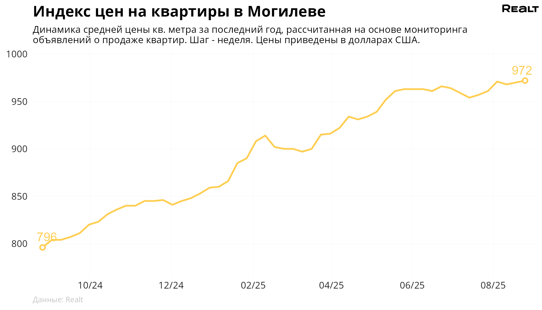 За неделю, с 18 по 25 августа 2025 года, средняя цена в объявлениях о продаже квартир в Могилеве выросла на 0.2% и составила 972 $/м2. При этом количество квартир в продаже увеличилось на 1.2%. Что еще произошло на рынке жилья крупнейших городов Могилевской области за семь дней — в материале.