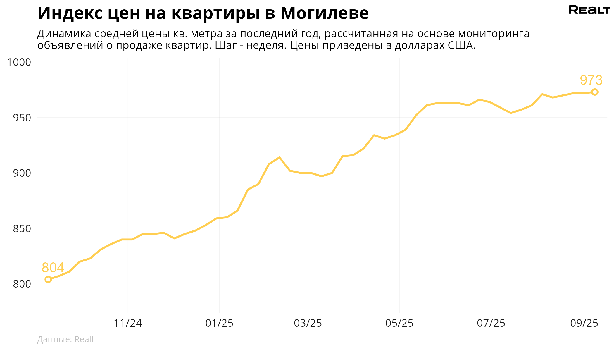 За неделю, с 1 по 8 сентября 2025 года, средняя цена в объявлениях о продаже квартир в Могилеве выросла на 0.1% и составила 973 $/м2. При этом количество квартир в продаже уменьшилось на 0.4%. Что еще произошло на рынке жилья крупнейших городов Могилевской области за семь дней — в материале.