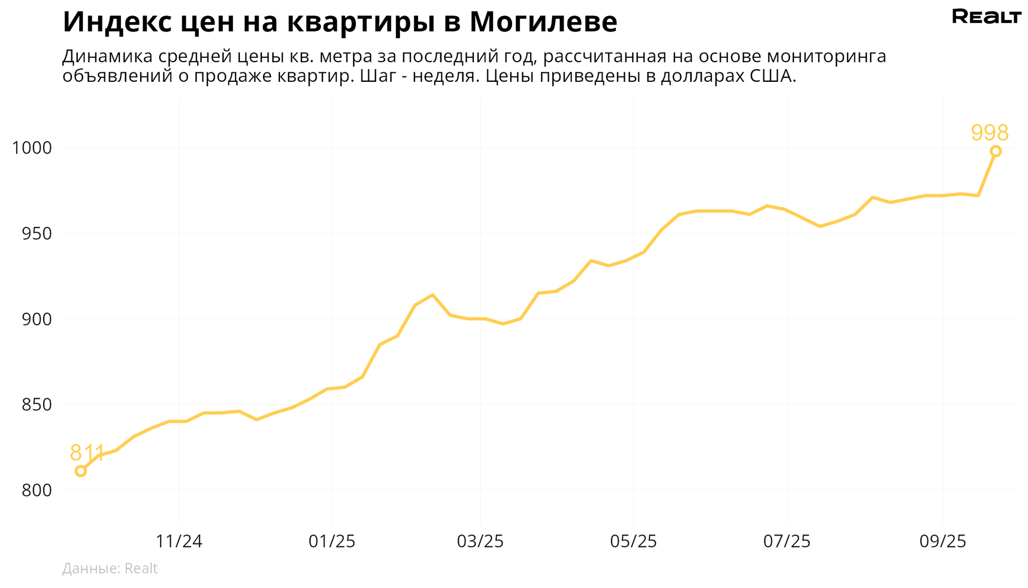 За неделю, с 15 по 22 сентября 2025 года, средняя цена в объявлениях о продаже квартир в Могилеве выросла на 2.7% и составила 998 $/м2. При этом количество квартир в продаже увеличилось на 5%. Что еще произошло на рынке жилья крупнейших городов Могилевской области за семь дней — в материале.