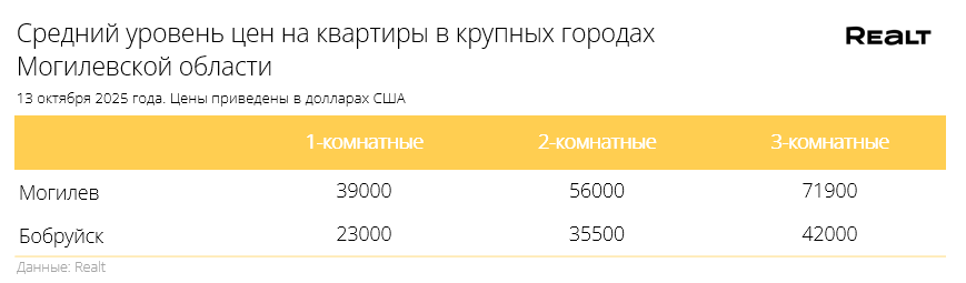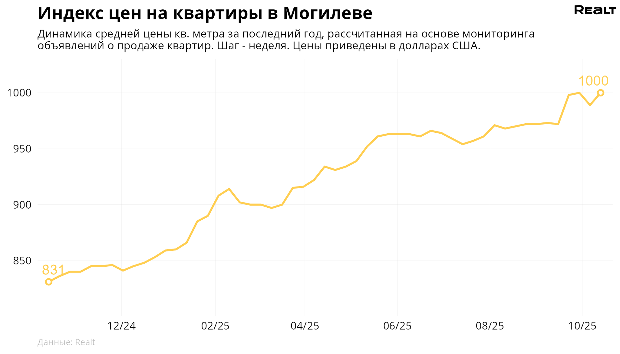 За неделю, с 6 по 13 октября 2025 года, средняя цена в объявлениях о продаже квартир в Могилеве выросла на 1.1% и составила 1000 $/м2. При этом количество квартир в продаже уменьшилось на 4.3%. Что еще произошло на рынке жилья крупнейших городов Могилевской области за семь дней — в материале.