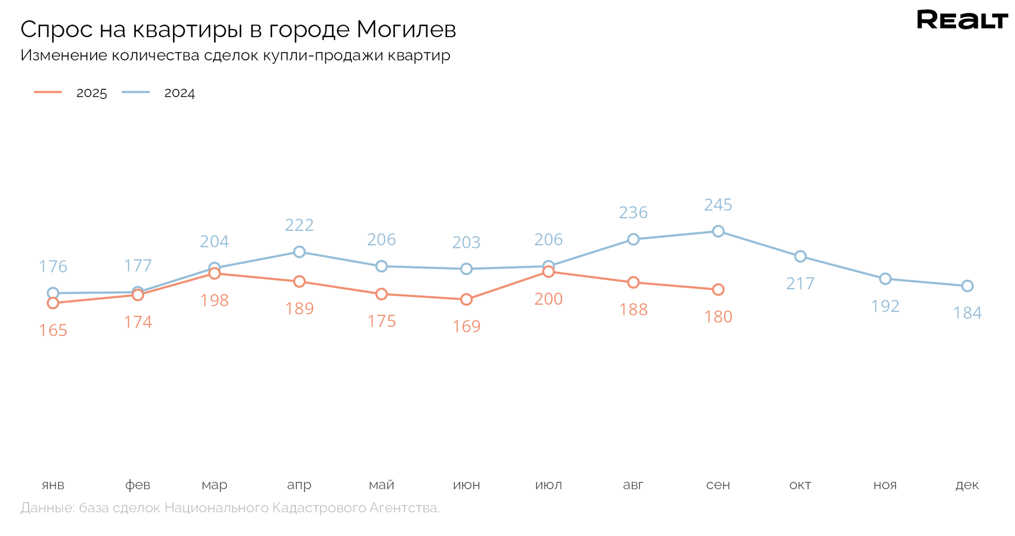 За сентябрь в Могилеве заключили 180 сделок купли-продажи квартир, что на 4.3% меньше, чем в предыдущем месяце. По сравнению с аналогичным месяцем прошлого года спрос на квартиры уменьшился на 26.5%.
