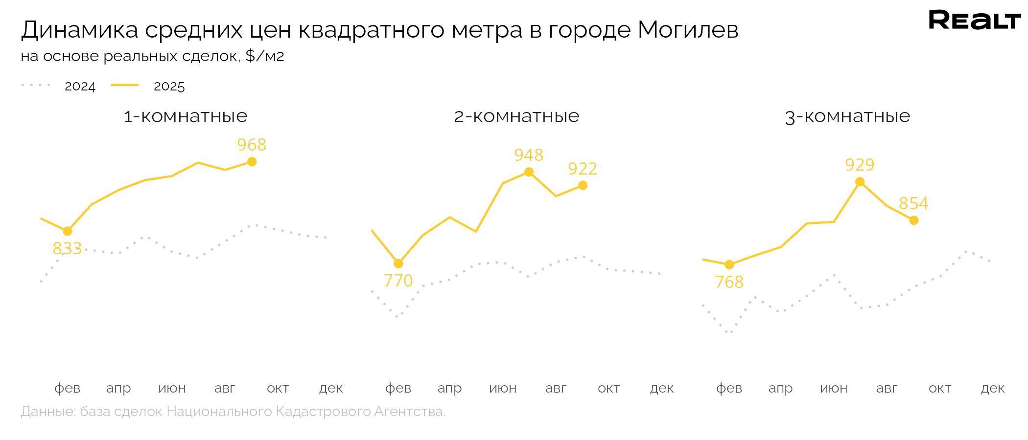 По данным сделок средняя цена квадратного метра 1-комнатных квартир, которые на данный момент продаются в среднем по 968 $/м2, увеличилась на 1.7%. Средняя стоимость 2-комнатных квартир в Могилеве составляет 922 $/м2 (+2.3% за месяц). 3-комнатные квартиры продавали в среднем за 854 $/м2 (-3.2% за месяц).