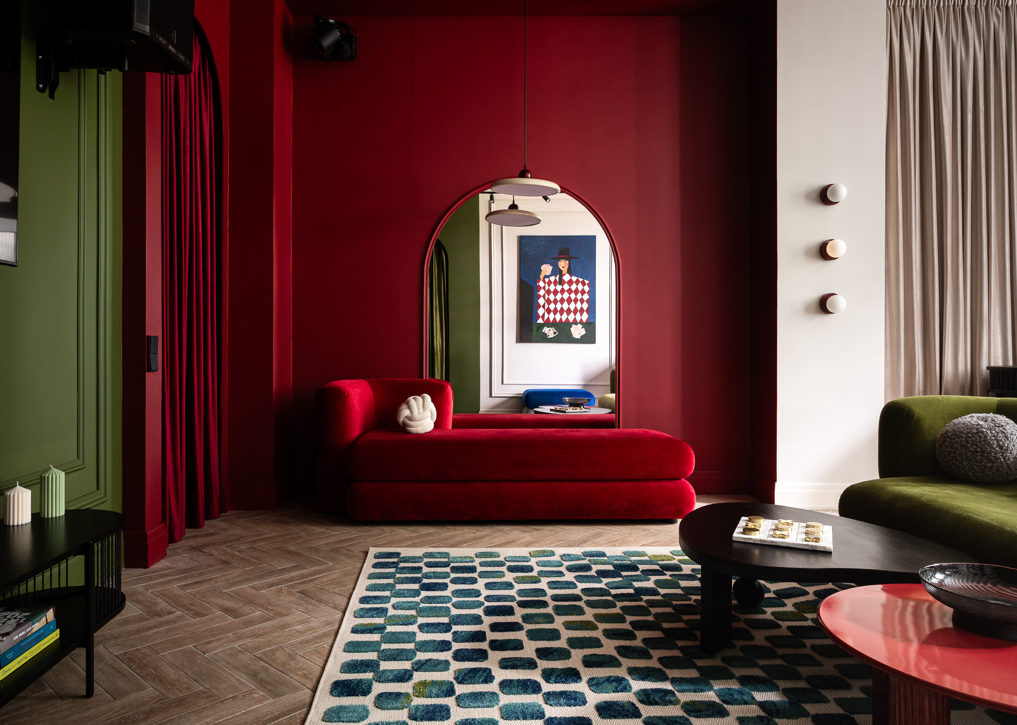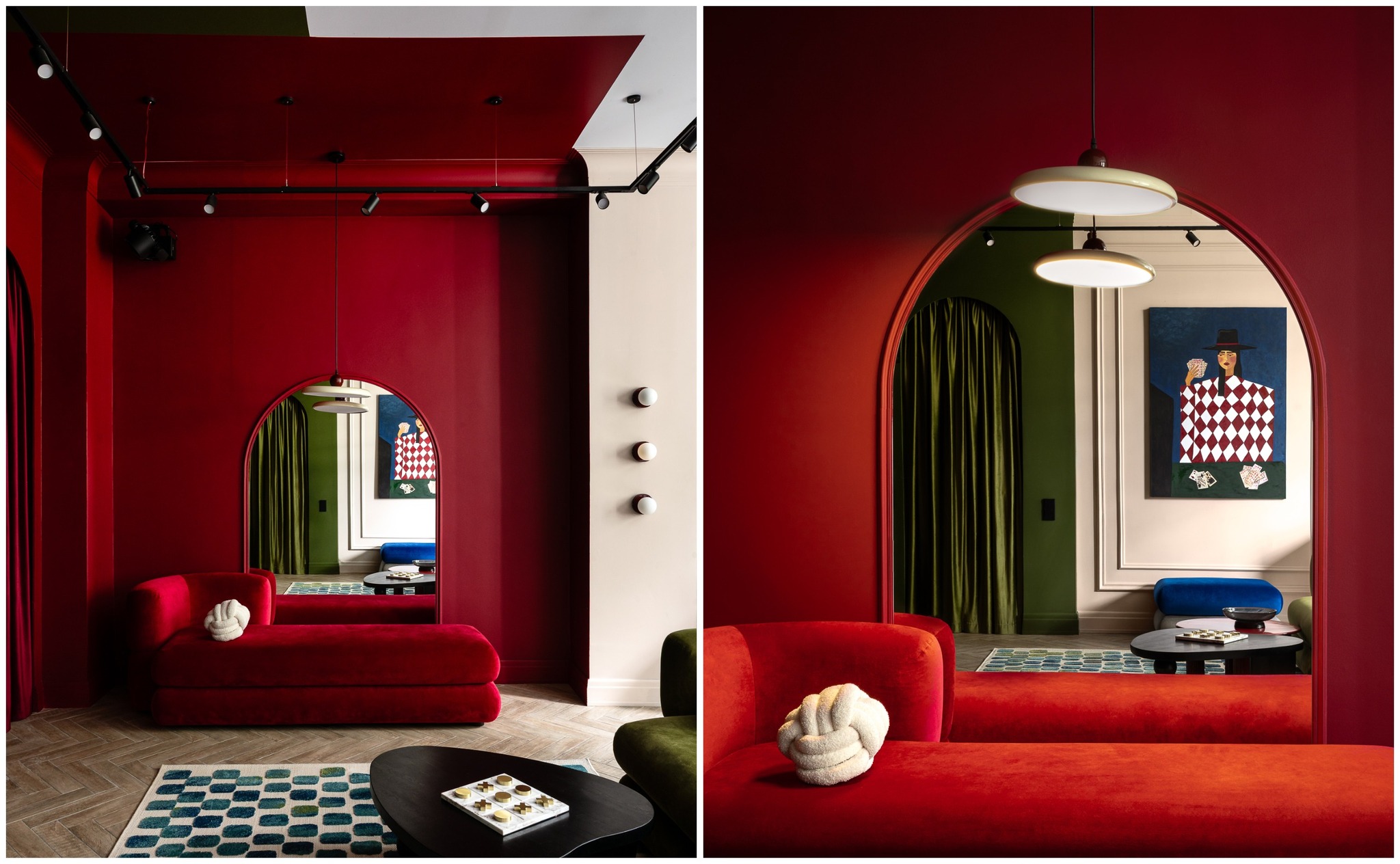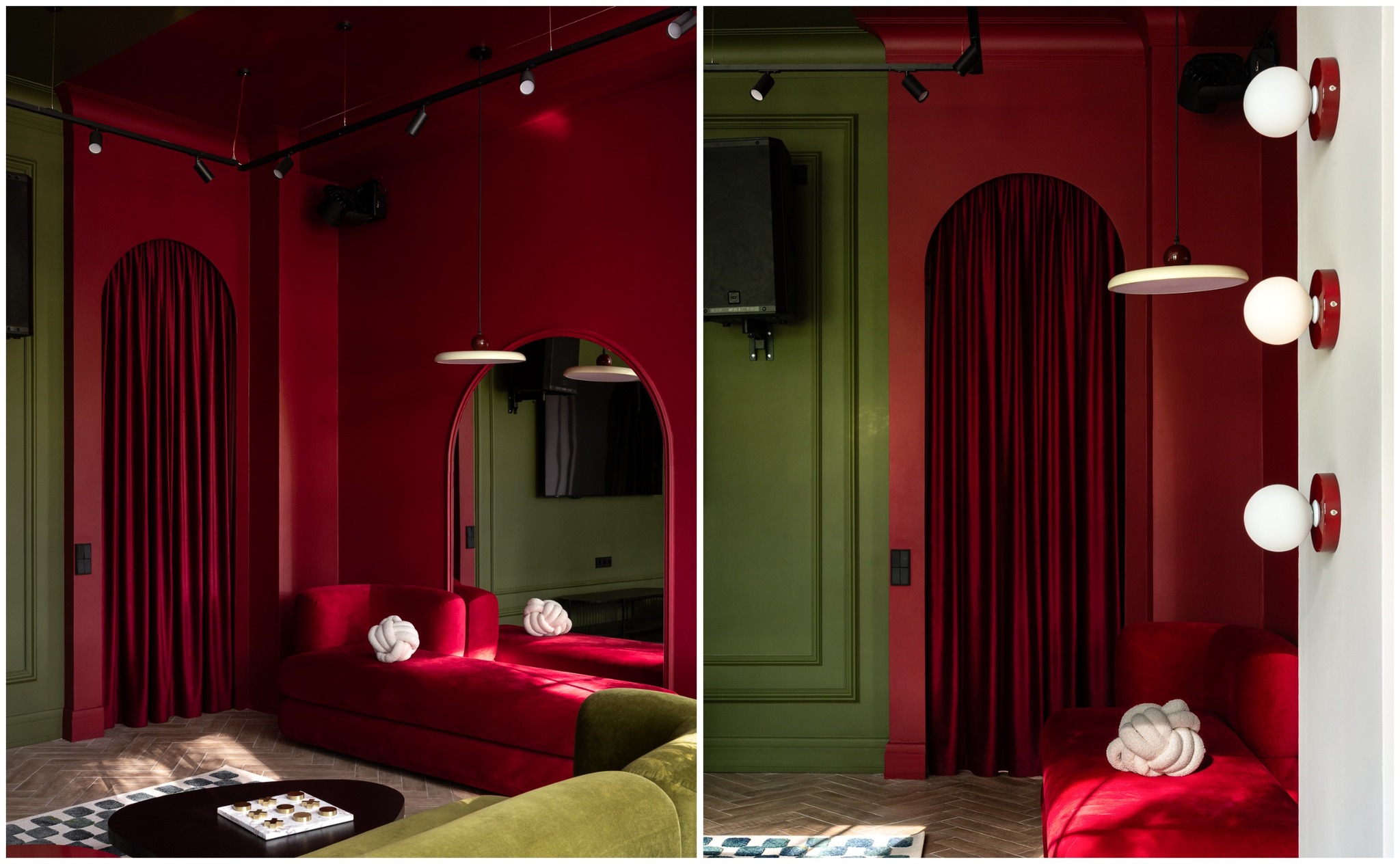 Основные цвета концепции — насыщенный красный и яркий лаймовый. Эти оттенки плавно переходят со стен на потолок, формируя геометрический рисунок.
