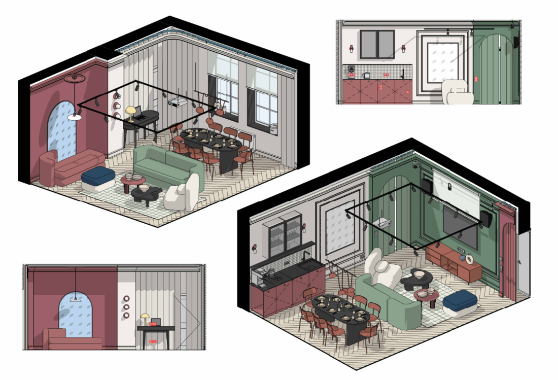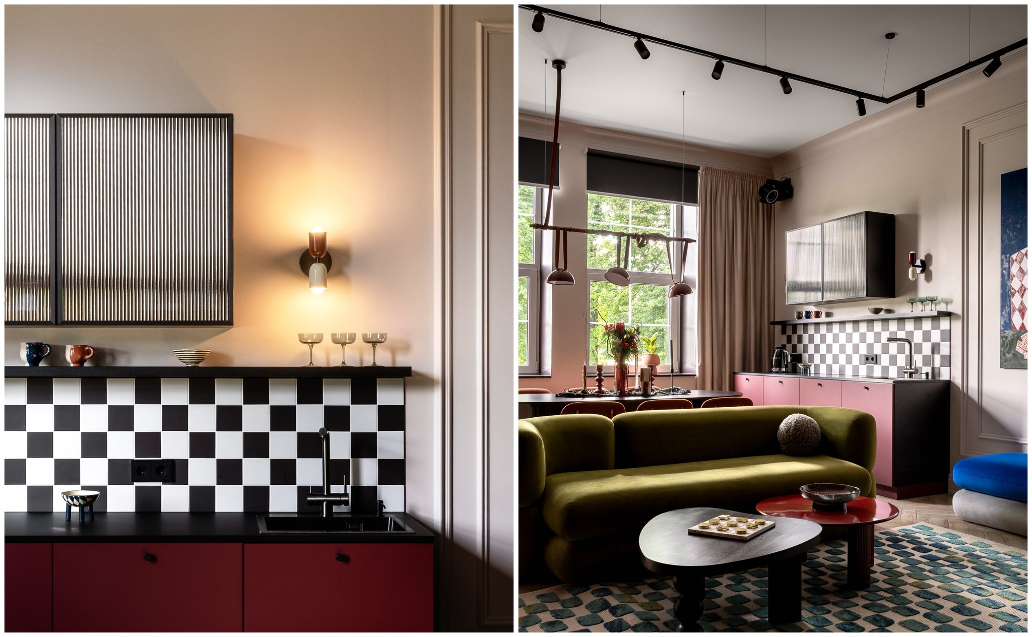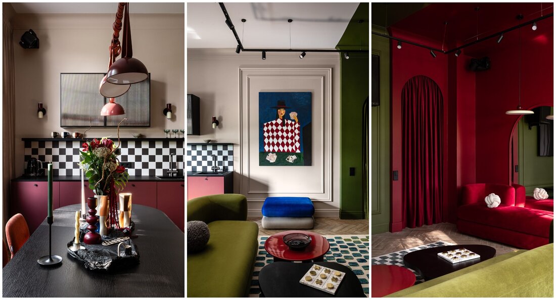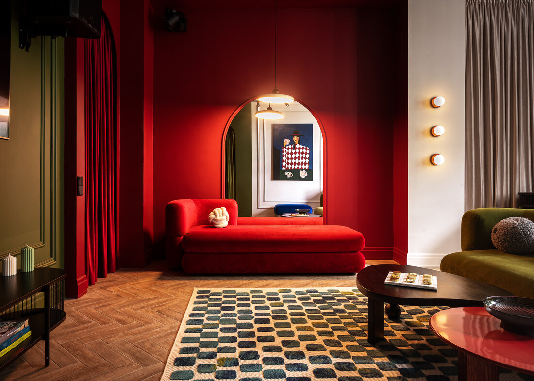 Основные цвета концепции — насыщенный красный и яркий лаймовый. Эти оттенки плавно переходят со стен на потолок, формируя геометрический рисунок.