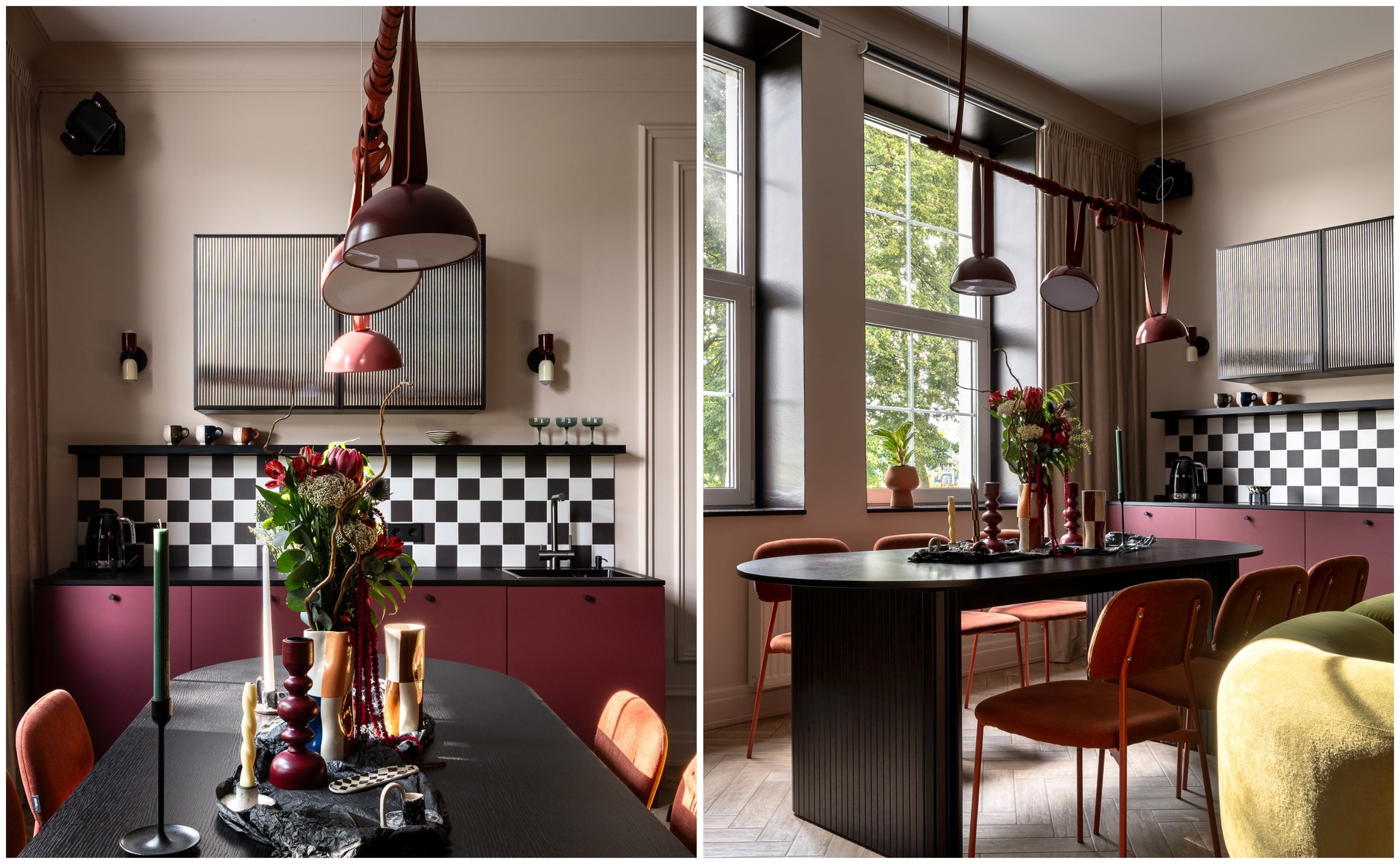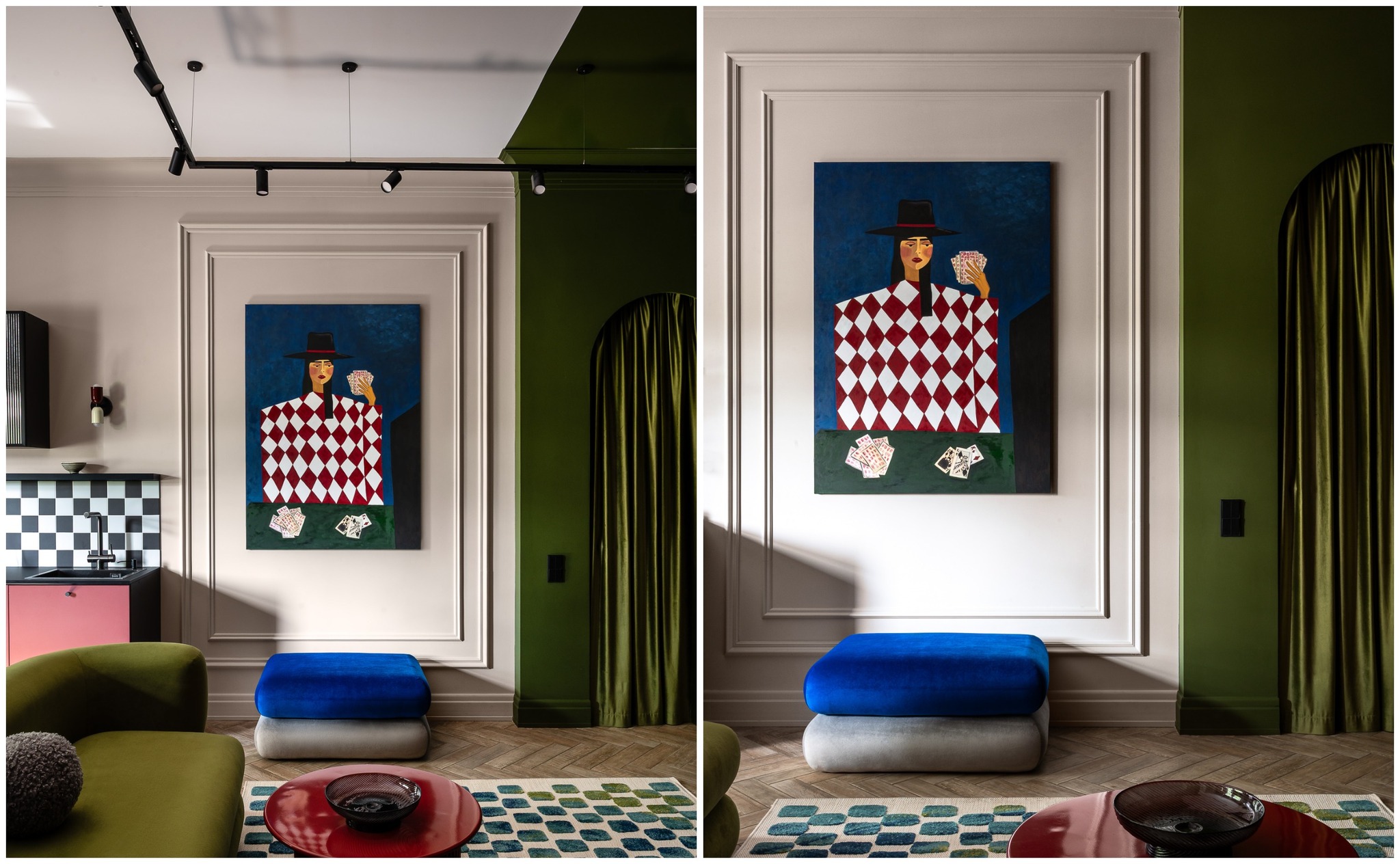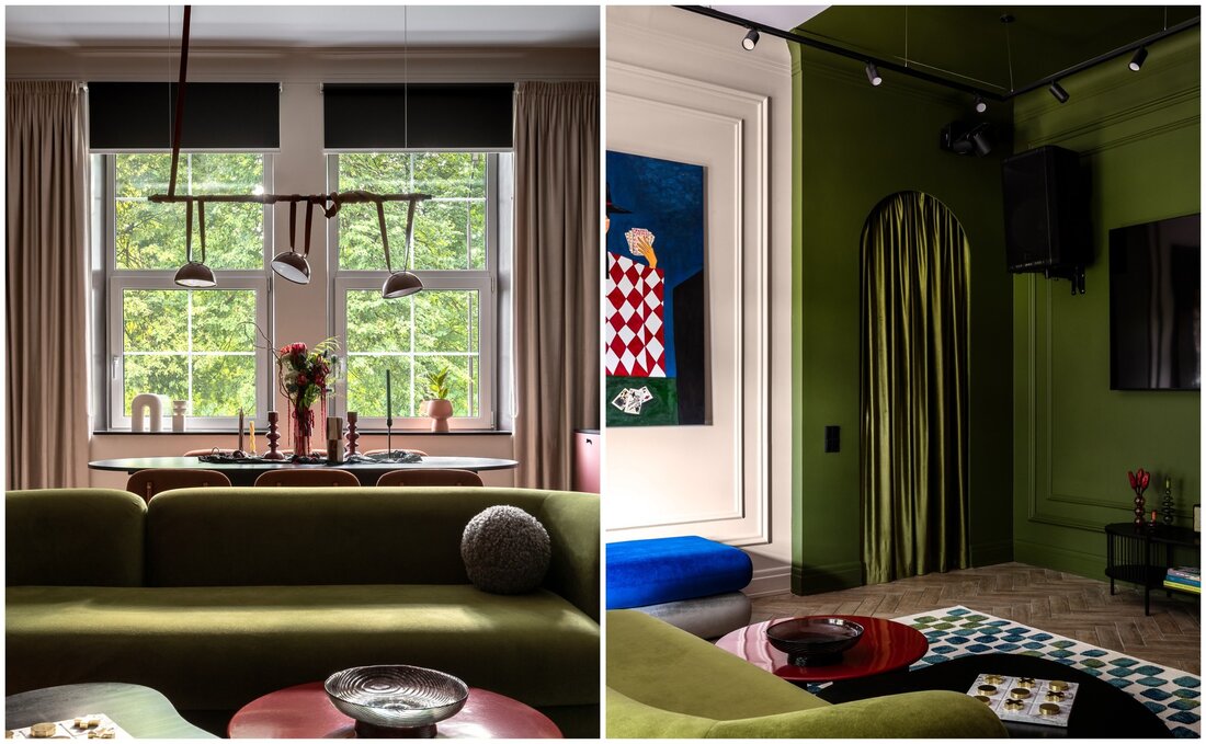 — Отдельное внимание мы уделили расстановке мебели. Пространство позволило разместить все таким образом, чтобы гости могли легко передвигать диван, стол, стулья, создавая новые зоны общения. Диваны стали акцентами в интерьере. Один из них сливается со стеной. Это техническое решение предопределило новое место для создания фотографий — настоящая «селфи-зона».