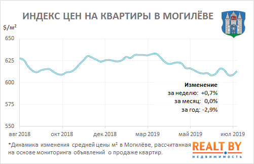 Средняя цена предложения в объявлениях о продаже квартир в Могилёве на минувшей неделе выросла на 0,7% и составила 614 $/м 2.
