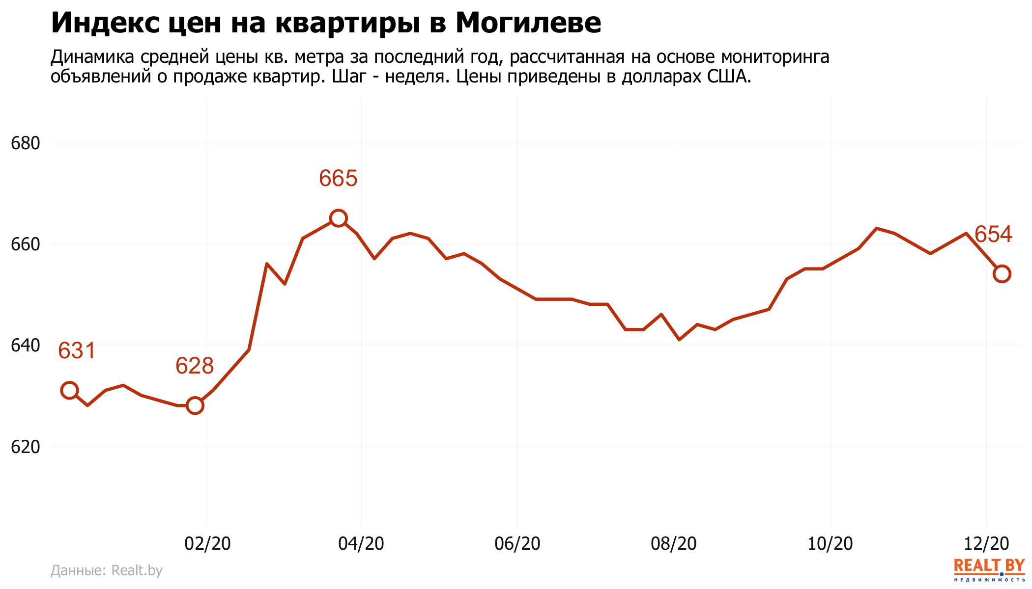 Средняя цена в объявлениях о продаже квартир в Могилеве снизилась на 0.6% и составила 654 $/м2.