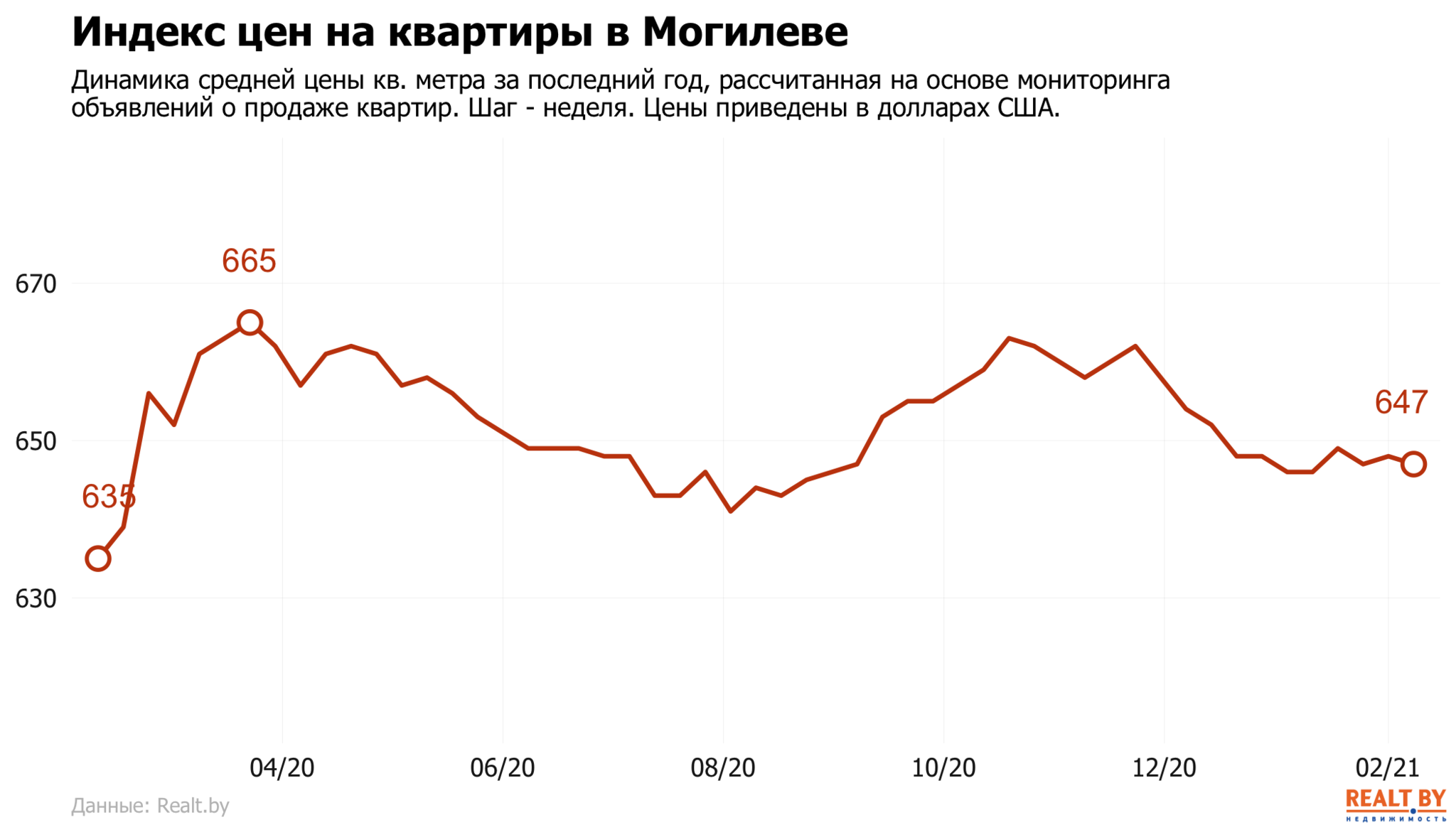 Средняя цена в объявлениях о продаже квартир в Могилеве снизилась на 0.2% и составила 647 $/м2.