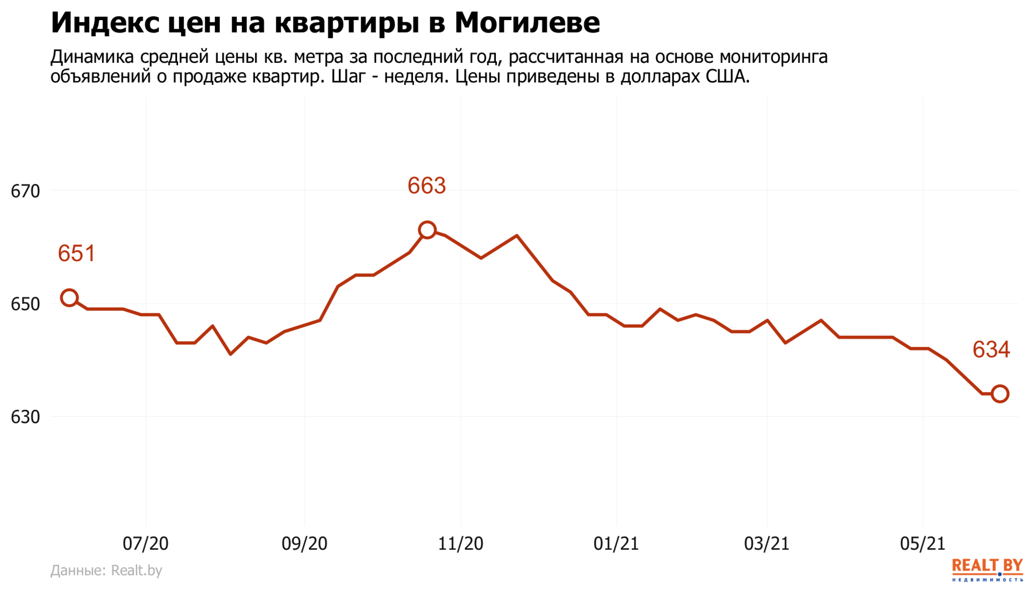 Средняя цена в объявлениях о продаже квартир в Могилеве не изменилась и составила 634 $/м2.