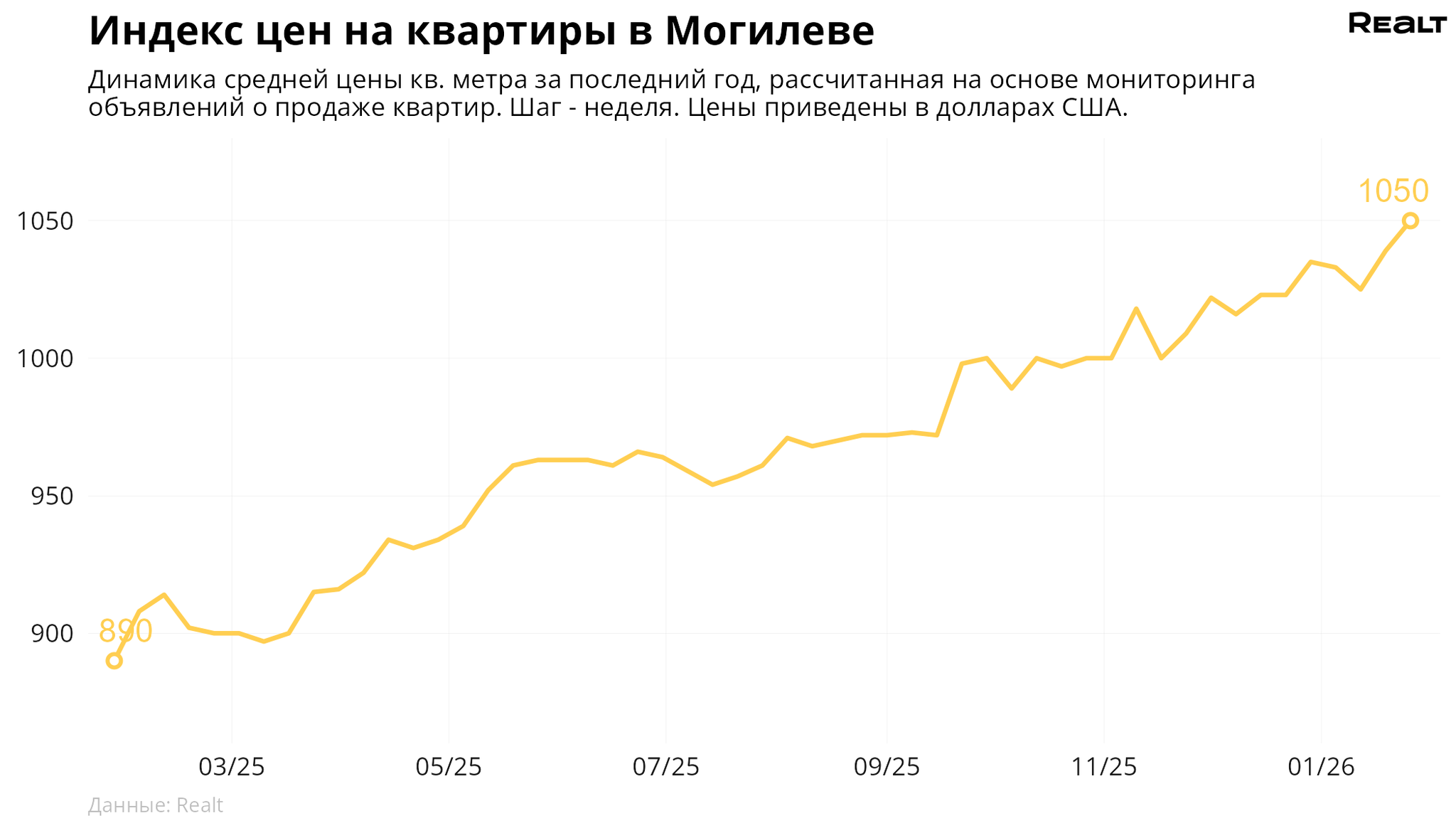 За неделю, с 19 по 26 января 2026 года, средняя цена в объявлениях о продаже квартир в Могилеве выросла на 1.1% и составила 1050 $/м2. При этом количество квартир в продаже уменьшилось на 0.4%. Что еще произошло на рынке жилья крупнейших городов Могилевской области за семь дней — в материале.