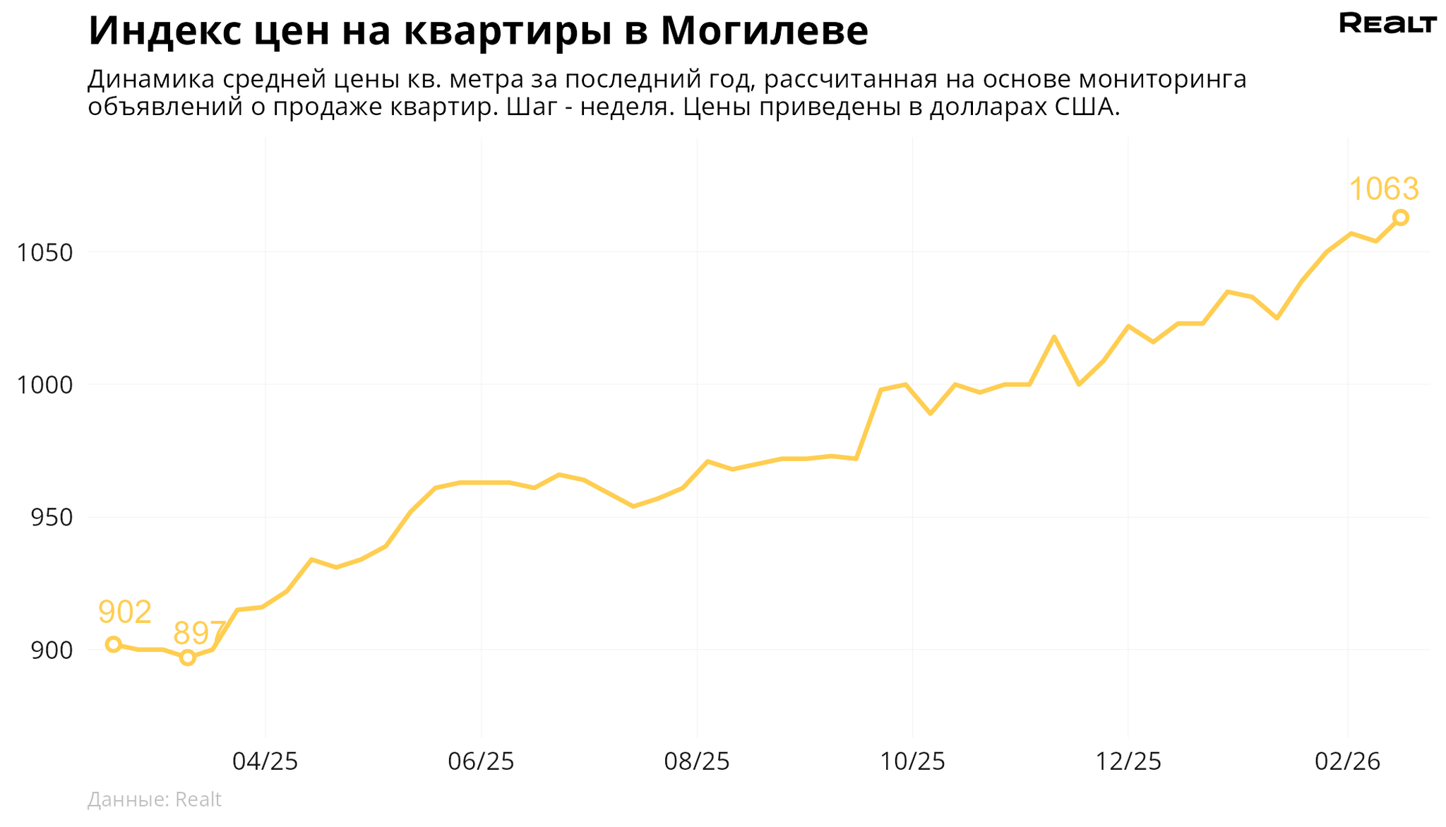 За неделю, с 9 по 16 февраля 2026 года, средняя цена в объявлениях о продаже квартир в Могилеве выросла на 0.9% и составила 1063 $/м2. При этом количество квартир в продаже уменьшилось на 0.7%. Что еще произошло на рынке жилья крупнейших городов Могилевской области за семь дней — в материале.