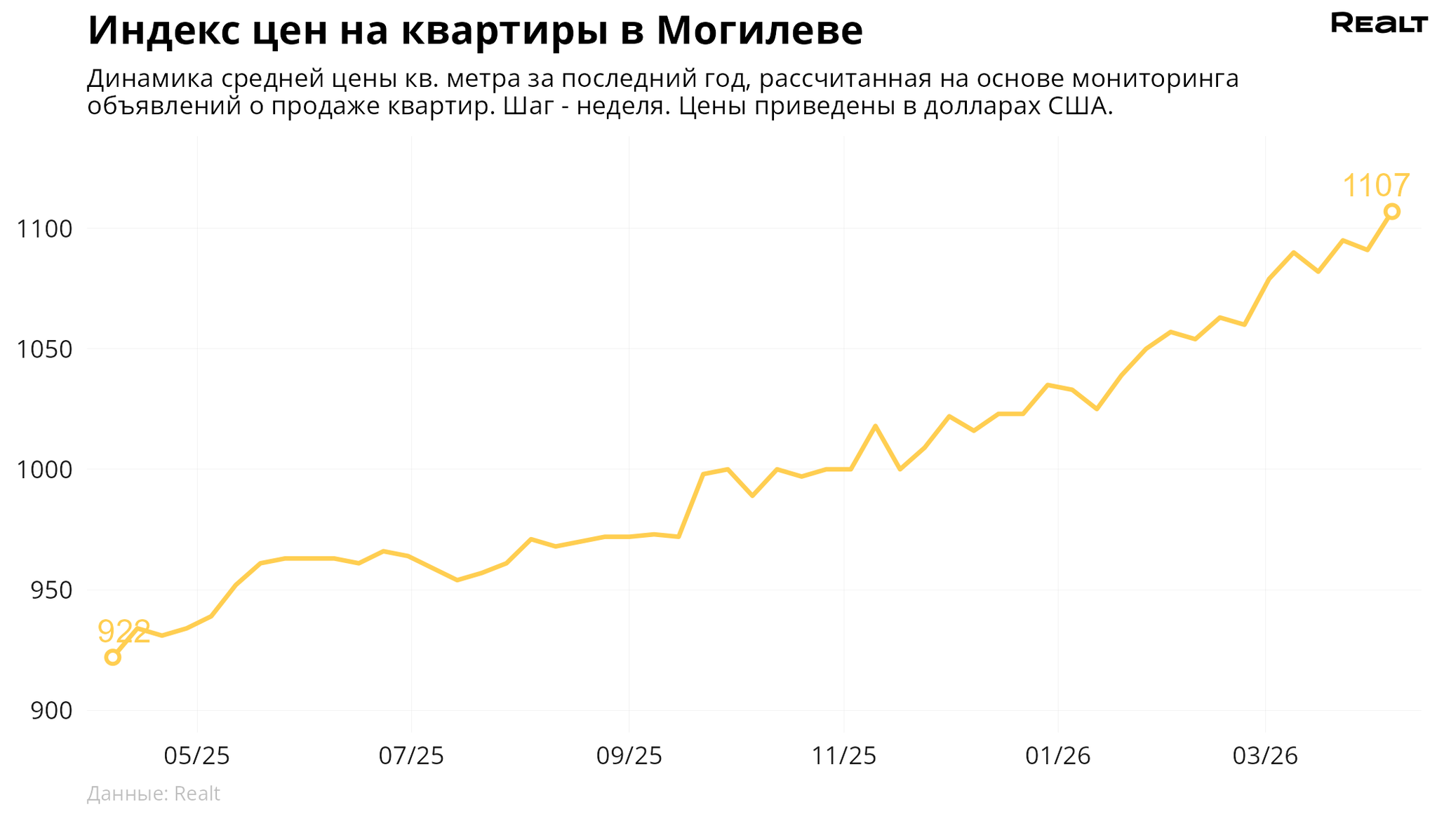 За неделю, c 30 марта по 6 апреля 2026 года, средняя цена в объявлениях о продаже квартир в Могилеве выросла на 1.5% и составила 1107 $/м2. При этом количество квартир в продаже увеличилось на 3.9%. Что еще произошло на рынке жилья крупнейших городов Могилевской области за семь дней — в материале.