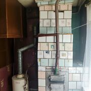 - Материал стен: основной дом — бревно; пристройка — шлакобетон и кирпич