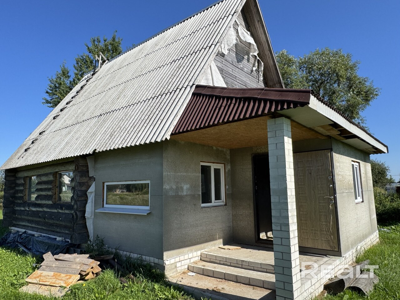 Недостроенный дом в Присно 2 по ул. Полевой, д.8 размером 6,30 х 9,30 из цилиндрованного бревна ручной рубки (зимний лес диаметром не менее 28 см). Участок площадью 10 соток. Оконные блоки и лестничный марш выполнены из мореного дуба. В дом заведена вода и местная канализация.