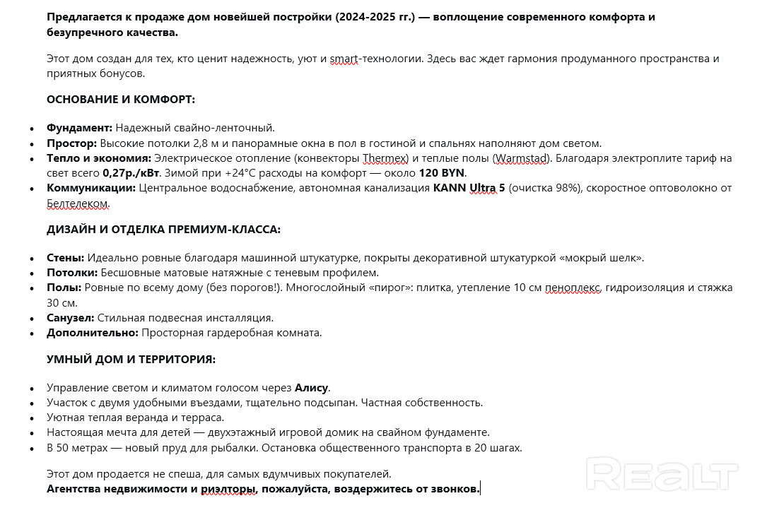 Предлагается к продаже дом новейшей постройки (2024-2025 гг.) — воплощение современного комфорта и безупречного качества. Фундамент: Надежный свайно-ленточный. Простор: Высокие потолки 2,8 м и панорамные окна в пол в гостиной и спальнях наполняют дом светом.Тепло и экономия: Электрическое отопление (конвекторы Thermex) и теплые полы (Warmstad). Благодаря электроплите тариф на свет всего 0,27р./кВт. Зимой при +24°C расходы на комфорт — около 120 BYN. ПОДРОБНОЕ ОПИСАНИЕ В ПОСЛЕДНЕМ ФОТО.