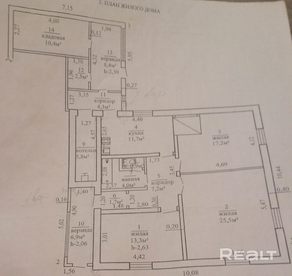 В доме 3 просторных комнаты (25.5/17/13).