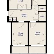 Расположена на 2-ом этаже 5-ти этажного кирпичного дома. Площадь по СНБ 66,4кв.м, жилая 43.7( 17.2,13.0,13.5)кухня 7.2, коридор 8,0 кв.м. Комнаты изолированные, выходят на обе стороны дома, 2 лоджии застеклённые.