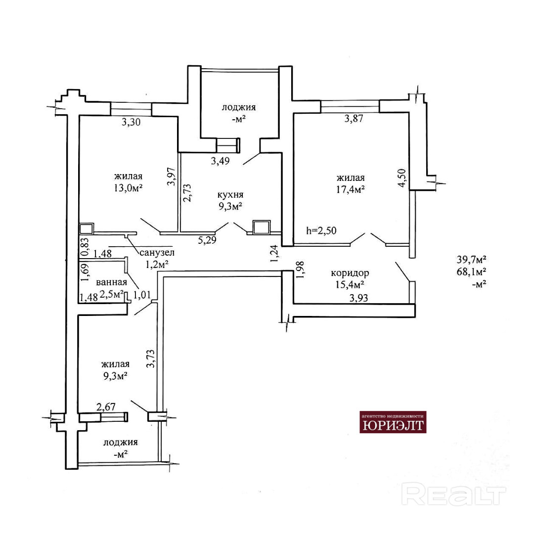 Общая площадь 68.1 кв.м. (без учета 2 лоджий), жилая 39.7 кв.м., кухня 9.3 кв.м. Имеется общий тамбур на 3 квартиры.