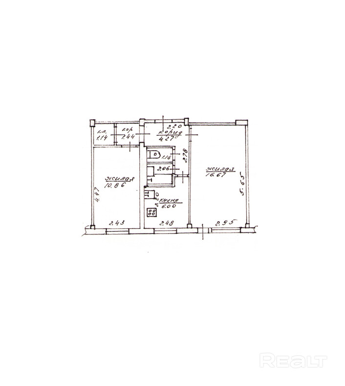 Квартира общей площадью 43.6 кв.м., жилая 27. 53 кв.м., кухня 6.0 кв.м.