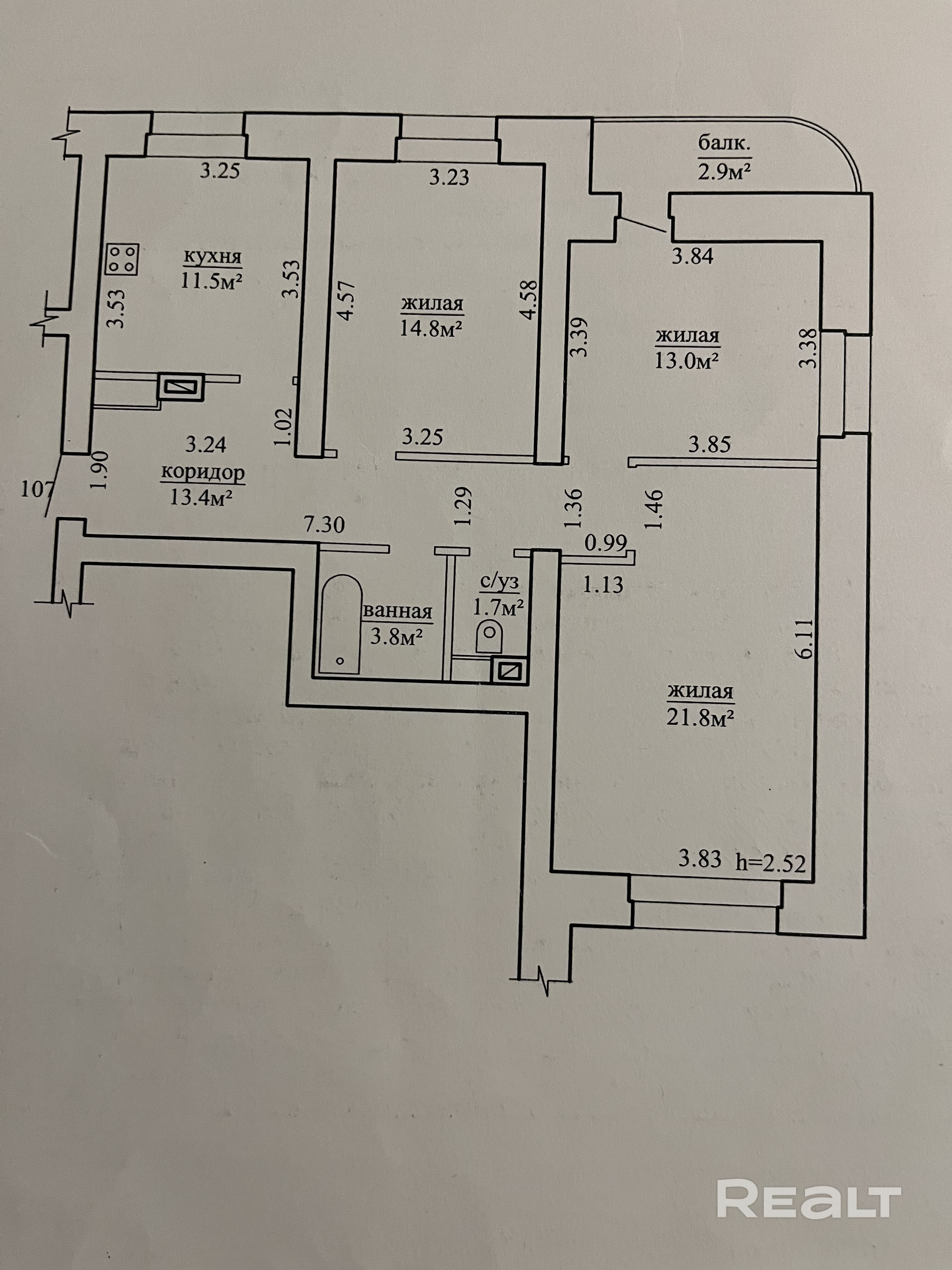 Квартира расположена на седьмом этаже десятиэтажного дома, чистый просторный подъезд, грузовой лифт, в общем коридоре есть возможность еще взять дополнительную комнатку под технужды. Квартира светлая и теплая, на две стороны дома, общей площади 82.9 м2 по СНБ, планировка классная, все комнаты раздельные, прямоугольной формы, есть лоджия, большая кухня - 11,5 м2, раздельный санузел, просторный холл. Хорошее общее состояние, все окна стеклопакеты ПВХ, лоджия застеклена, на полу стяжка и положен ламинат, матовые натяжные потолки, стены все идеально выровнены, оклеены, в санузле плитка, рабочая сантехника. Если нужно новому владельцу - то оставим кухонный гарнитур и спальный гарнитур.