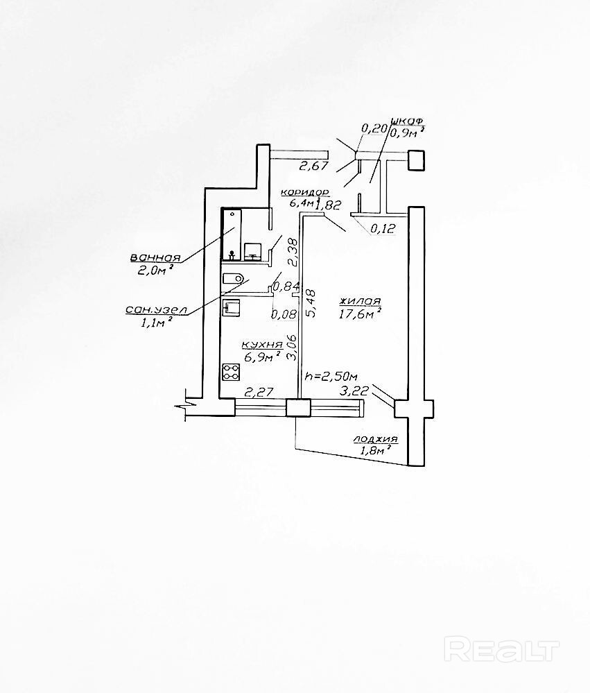 Общая площадь: 34,9 кв.м., 17,6 жилая кв.м., кухня 6,9 кв.м.