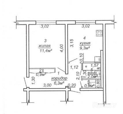 Однокомнатная квартира общей площадью 30,8 кв.м., жилая площадь - 11,4 кв.м., площадь кухни - 9,3 кв.м. Расположена на 1 этаже.