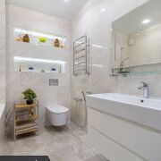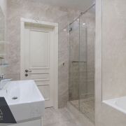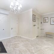 - Стены облицованы декоративной штукатуркой, а на полу уложен керамогранит. В санузле и гардеробной пол с подогревом, что делает их более комфортными для пользования. В санузле установлена инсталляция, а также гигиенический душ. Установлен бойлер на 50л. Вся ванная облицована Итальянской плиткой.