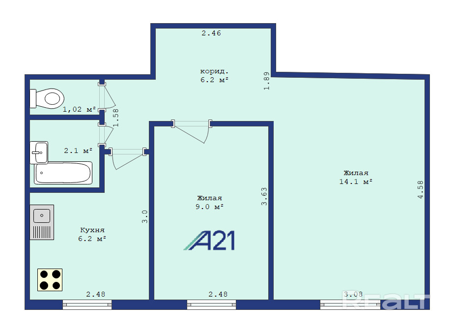 Планировка: Общая площадь: 38.7 кв. м., две изолированные комнаты (14.1 кв. м. и 9 кв. м.). Грамотная планировка коридора.