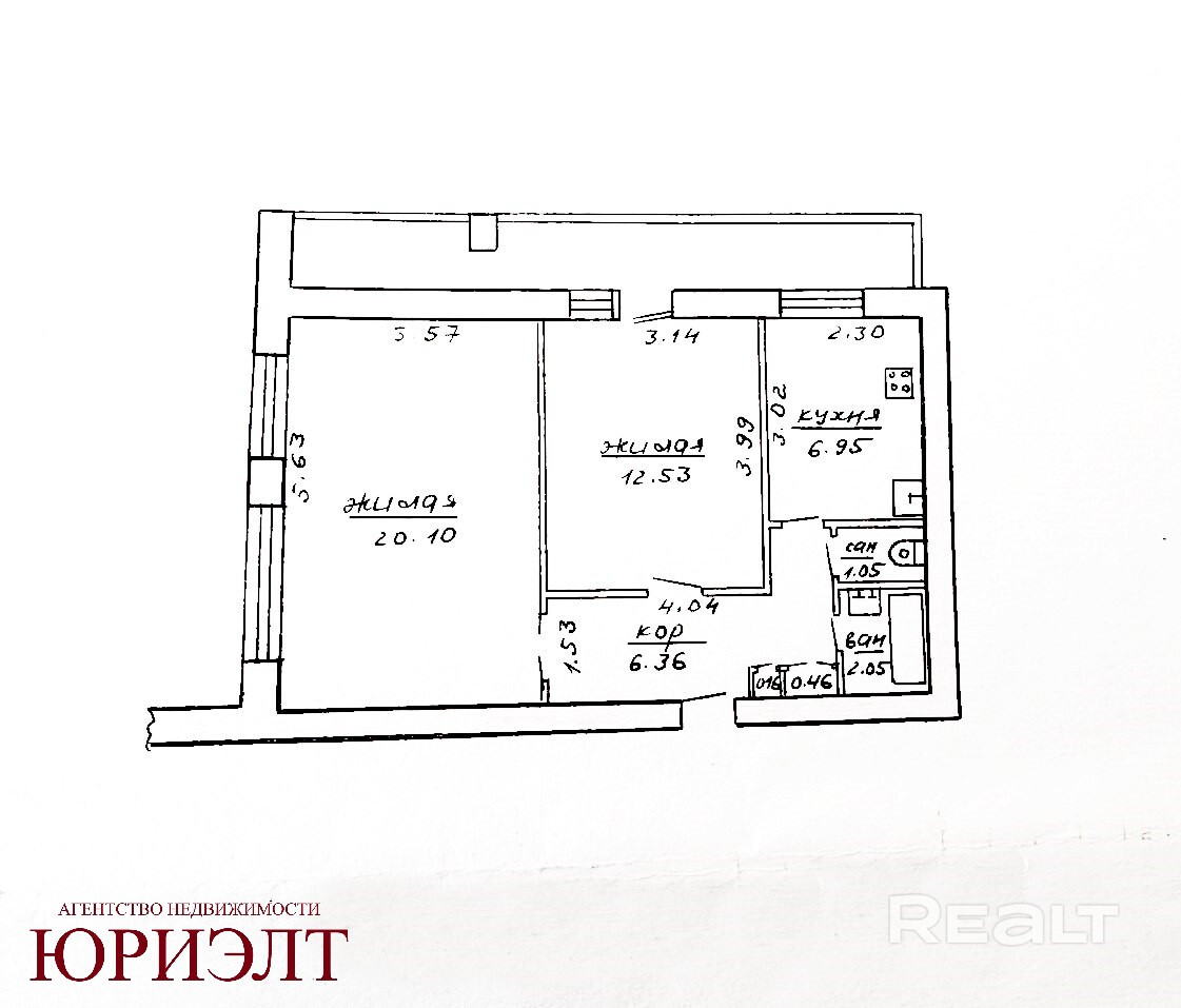 Общая площадь 49.66 м.кв. без учета лоджии, жилая 32.63 м.кв., кухня 6.95 м.кв.