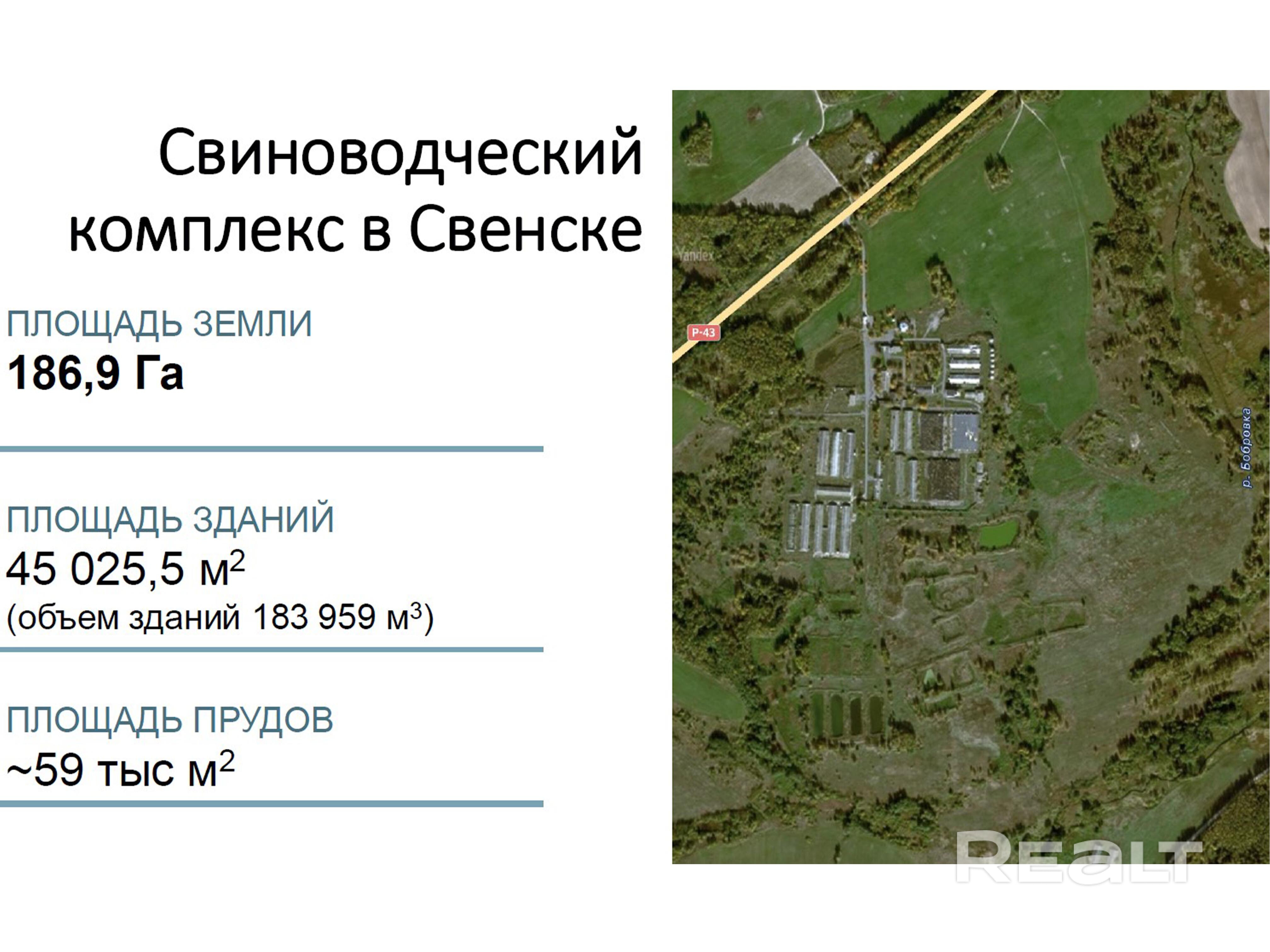 Продажа Комплекса зданий свиноводческого комплекса в Могилевской области по адресу: деревня Свенск, общей площадью земельного участка-186,9 Га и общей площадью зданий - 45025 кв.м , средняя квадратура одного здания - 1000 кв.м