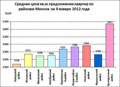 На 9 января лидером по величине средних цен предложения квартир в Минске является Центральный (1671 $/кв.м) район. Самая низкая средняя цена предложения в Заводском (1138 $/кв.м) районе.