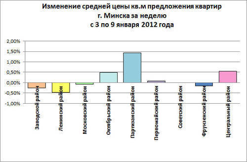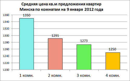 За неделю с 3 по 9 января 2012 года по данным аналитического центра Realt.by средняя цена предложения квадратного метра квартир на вторичном рынке жилья в г. Минске выросла на 0,15%, составив 1299 $.