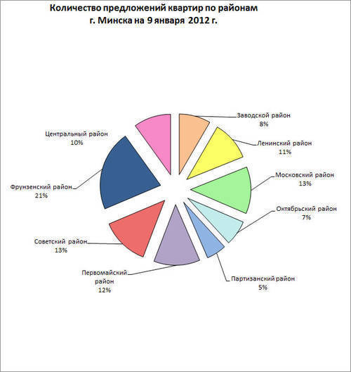 Лидером по объему предложения вторичного жилья в г. Минске на 9 января 2012 года является Фрунзенский район, 21,4% от всего предложения. Количество предложений квартир в базе Realt.by за неделю уменьшилось на 4,26%.