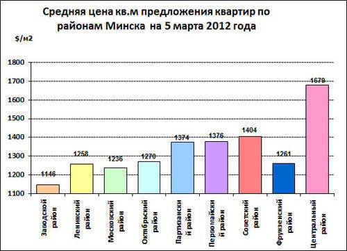 На 5 марта лидером по величине средних цен предложения квартир в Минске является Центральный (1679 $/кв.м) район. Самая низкая средняя цена предложения в Заводском (1146 $/кв.м) районе.