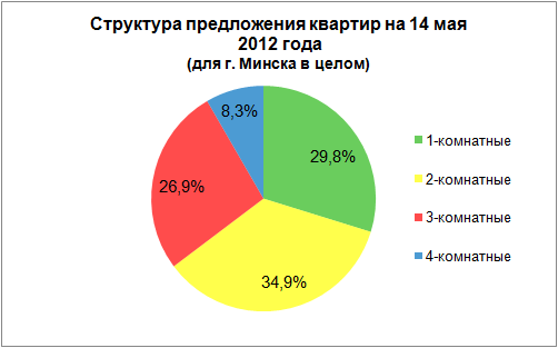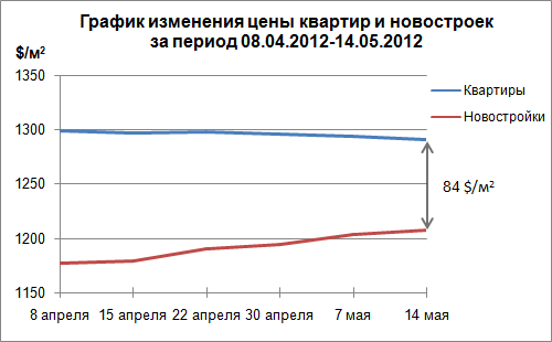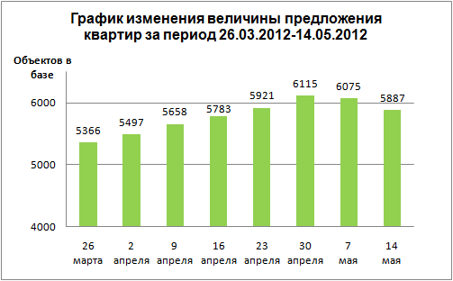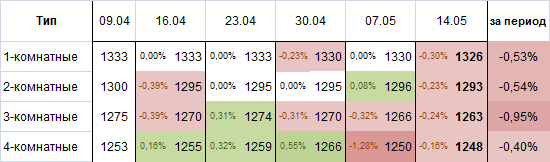 На 14 мая по величине средней цены квартир наблюдается падение по всем сегментам без исключения. Однокомнатные квартиры подешевели на 0,30%, двух-, трех- и четырехкомнатные на 0,23%, 0,24% и 0,16% соответственно. Аналогичная ситуация наблюдается и в месячном интервале. Таблица изменения цены квартир в %: