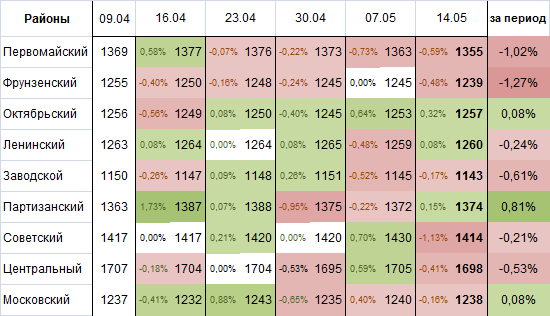 На прошедшей неделе положительную динамику демонстрировали Партизанский, Ленинский и Октябрьский районы. Падение наблюдалось в 6 районах из 9: Московском, Центральном, Фрунзенском, Партизанском, Ленинском, Заводском, Первомайском и Советском районах.