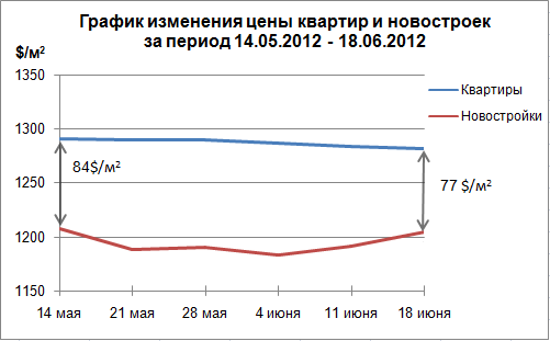 Для предложения на вторичном рынке за прошедшую неделю был отмечен очередной виток падения. Интересный факт, но отметка в 1281 $/м2 — абсолютный минимум за всю историю наблюдений портала Realt.by. Что касается первичного рынка, то здесь был зафиксирован сравнительно высокий рост — +1,08%. Таким образом разность средних цен на 18 июня составила 77 $, что также является минимальным значением в этом году.