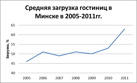 В 2011 году уровень загрузки минских гостиниц в среднем составил 63%, рекордный уровень за последние 7 лет (см. рис.1). По европейским меркам 63% - это неплохой показатель среднего уровня загрузки (см. рис 2).