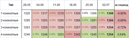 Объем предложения за минувшую неделю увеличился на 1,5%. Больше всего в базе данных прибавилось 1-комнатных квартир +3,45%. Также существенный прирост наблюдался в сегменте 4-хкомнатных квартир +2,1%. Количество 2-х комнатных квартир увеличилось на 1,03%, 3-хкомнатных квартир стало меньше на 0,99%.