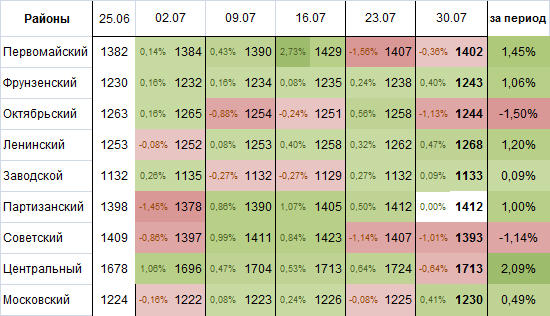 Что касается районных различий изменения цен предложения, то на 30 июля они выглядят следующим образом: