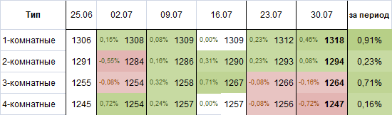 Динамика изменения стоимости квартир за неделю выглядит следующим образом: